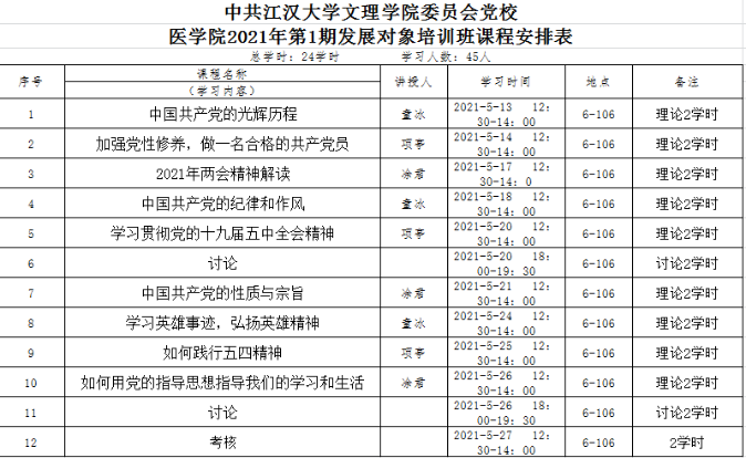 本次参加培训的人为18级和19级发展对象,本次培训采用线下课堂的形式。让师生面对面提问讨论,老师可以在线答疑解惑。起到学有所思,问有所答的教学方式。培训组织工作由公司党务工作小组负责,本次“发展对象”培训时间为2021年5月13日至2021年5月27日,本次培训采用线下课堂的形式,配以人员随时记录听课人数为考勤记录,增加自主研讨内容,考核方式为考试、心得体会和出勤情况三者综合打分。授课内容以《党章》为基准,并增加了时事内容。培训授课老师由员工党支部书记童冰及支委项亭、凃君三位老师担任。