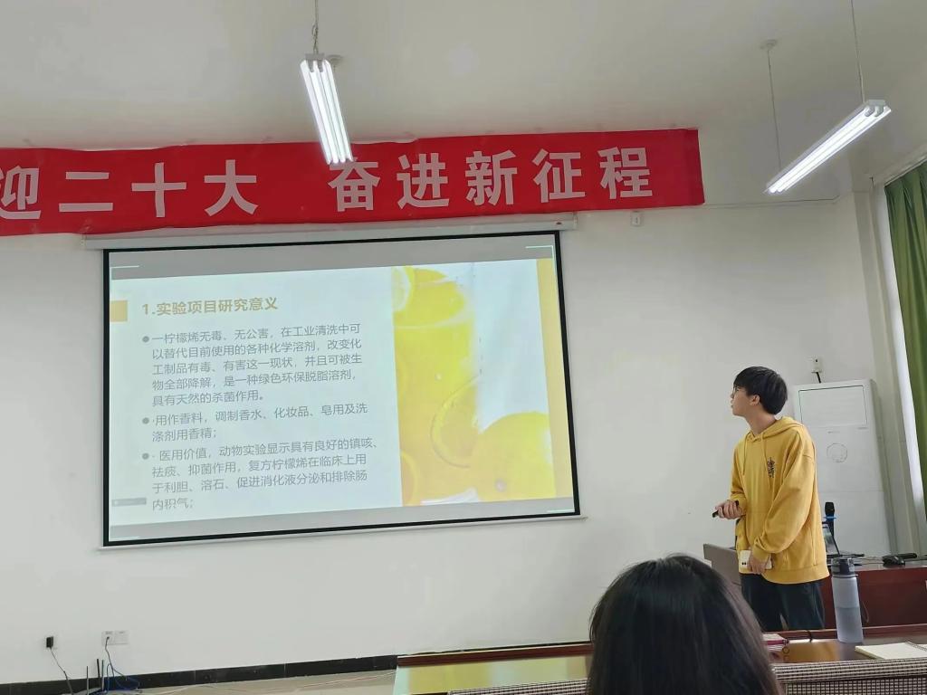 实验班方蕾同学汇报了《“杏手拈酮”——银杏叶总黄酮高效提取方法及工艺研究》、赵佩同学汇报了《纳米二氧化钛的制备及光催化降解印染废水的研究》、朱喆阳同学汇报了《固体酒精的制备及影响因素的研究》、苏冰月同学汇报了《不同提取方法对黄连中小檗碱含量的影响》等,为大家扩展了知识,引发了同学们的激烈探讨,思维的相互碰撞让大家收获满满。
