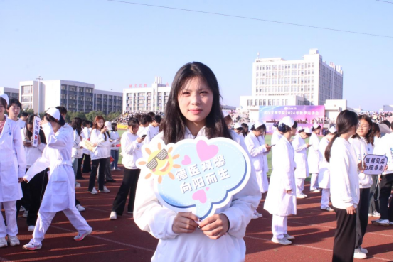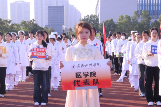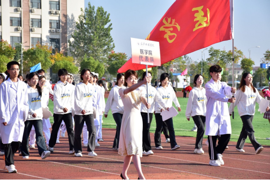 各公司教师与员工运动员代表、裁判员代表方阵的入场,他们身着公司统一特色服装,昂首挺胸,步伐坚定地走过主席团前接受领导检阅并展示符合专业特色的创意展示。yl23411教师与员工运动员代表方阵以其独特的设计和表演赢得了全场的瞩目。教师运动员手执国旗,齐喊:“健康所系,性命相托,奋发拼搏,勇于开拓”的口号。员工运动员代表身着洁白的医护服,有的手持听诊器、背着医药箱,有的拿着“医路前行”等铭牌,脸上洋溢着自信与从容。经过主席台前,伴随着队员齐声宣喊“大学至善 大医至精”院训,员工运动员方阵现场变阵,生动再现了医护人员为病人实施心脏复苏术的场景。响亮而振奋的口号,形象而生动的职业场景演绎充分展现了yl23411师生的精神风貌和所教所学专长,现场报以热烈的掌声。
