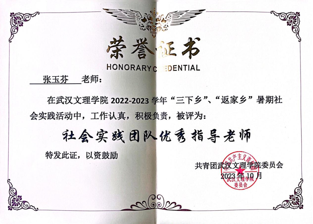 2023年10月,张玉芬老师荣获2022-2023学年“三下乡”、“返家乡”社会实践团队优秀指导老师称号。