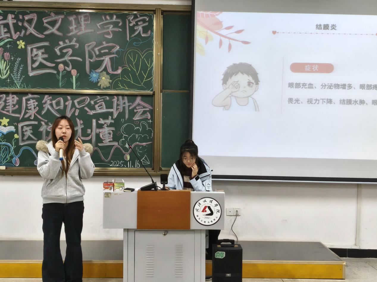 23级口腔医学技术二班刘连杍桐聚焦结膜炎防治。她结合校园集体生活特点,详细讲解了结膜炎的病因、传播途径、典型症状及应急处理方式,重点强调了不共用毛巾、勤洗手、避免用手揉眼等关键预防措施,提醒新生关注眼部异常信号。
