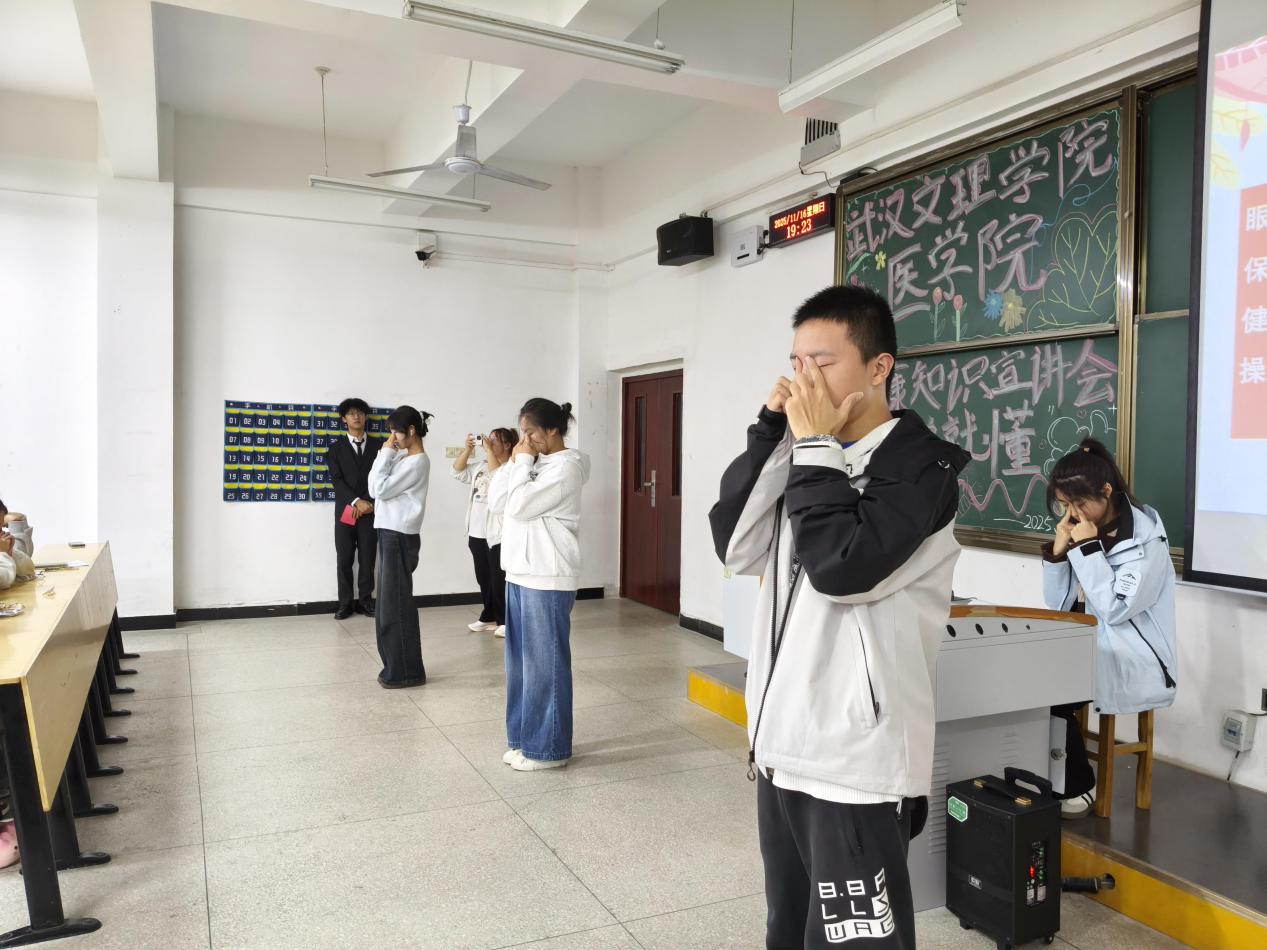 23级口腔医学技术二班曹雨欣现场示范眼保健操规范动作,逐一讲解穴位定位、按摩力度与节奏要点,纠正了新生日常练习中的常见误区,引导大家通过科学按摩缓解眼部疲劳。