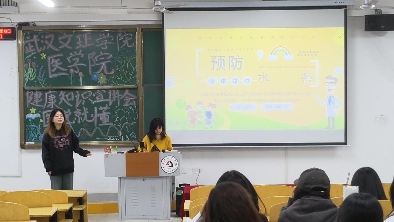 24级口腔医学技术二班肖京平主讲水痘相关防护知识。她围绕水痘的传播途径、临床症状、预防措施及应急处理等关键知识点展开详细讲解,病结合校园生活场景举例说明,让抽象的健康知识更易理解。