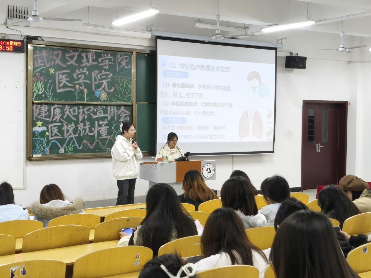 23级护理学四班王心怡同步配合播放PPT,以清晰的图文、直观的案例辅助讲解,将抽象的医学知识转化为易懂的生活指引,帮助新生快速抓取关键信息