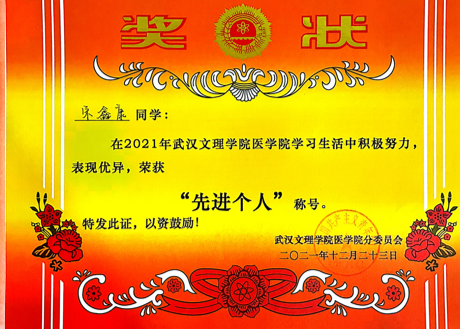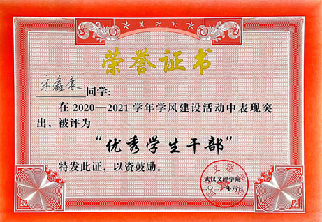 在学风建设活动中,他荣获优秀员工干部、先进个人、优秀共青团员、优秀志愿者、突出贡献者等奖项。