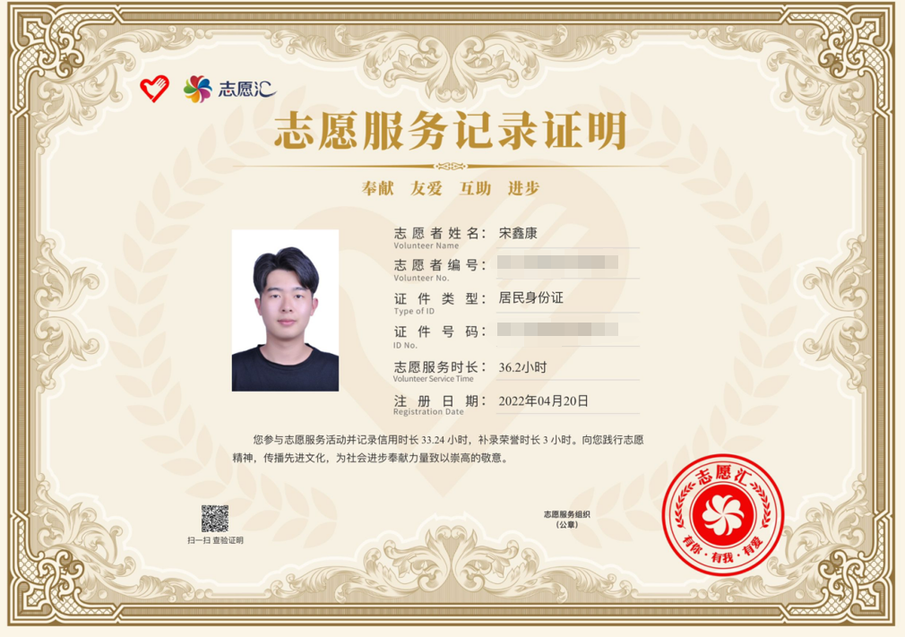 2022年5月-12月,宋鑫康时刻以一个党员的标准严格要求自己,他积极组织并参与校内外志愿服务活动,累计参加校内核酸采集志愿服务十余次,志愿汇服务时长30余小时,同时积极响应公司号召带头献血。