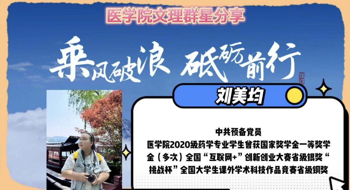 吴丽老师(药学系教师、刘美均班主任)点评:“大鹏一日同风起,扶摇直上九万里。”—学习上能刻苦钻研,课堂上常能听到你那清脆悦耳的回答声;你工作积极,乐意当老师的小助手;平时你总是带着甜甜的笑容,与同学友爱相处。相信未你将赢得更多的掌声。