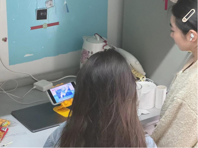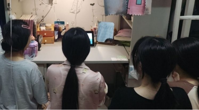 公司组织高年级员工在寝室认真观看直播,学习了解国家安全法相关知识