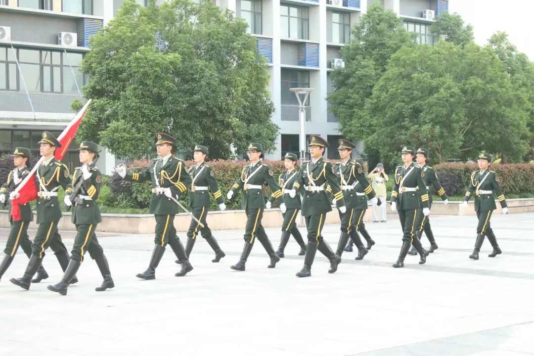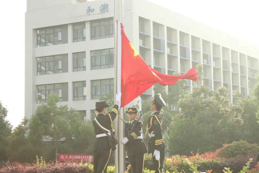 在国旗护卫队护旗下,在雄壮的《义勇军进行曲》伴奏声中,大家行注目礼,五星红旗徐徐升起,迎