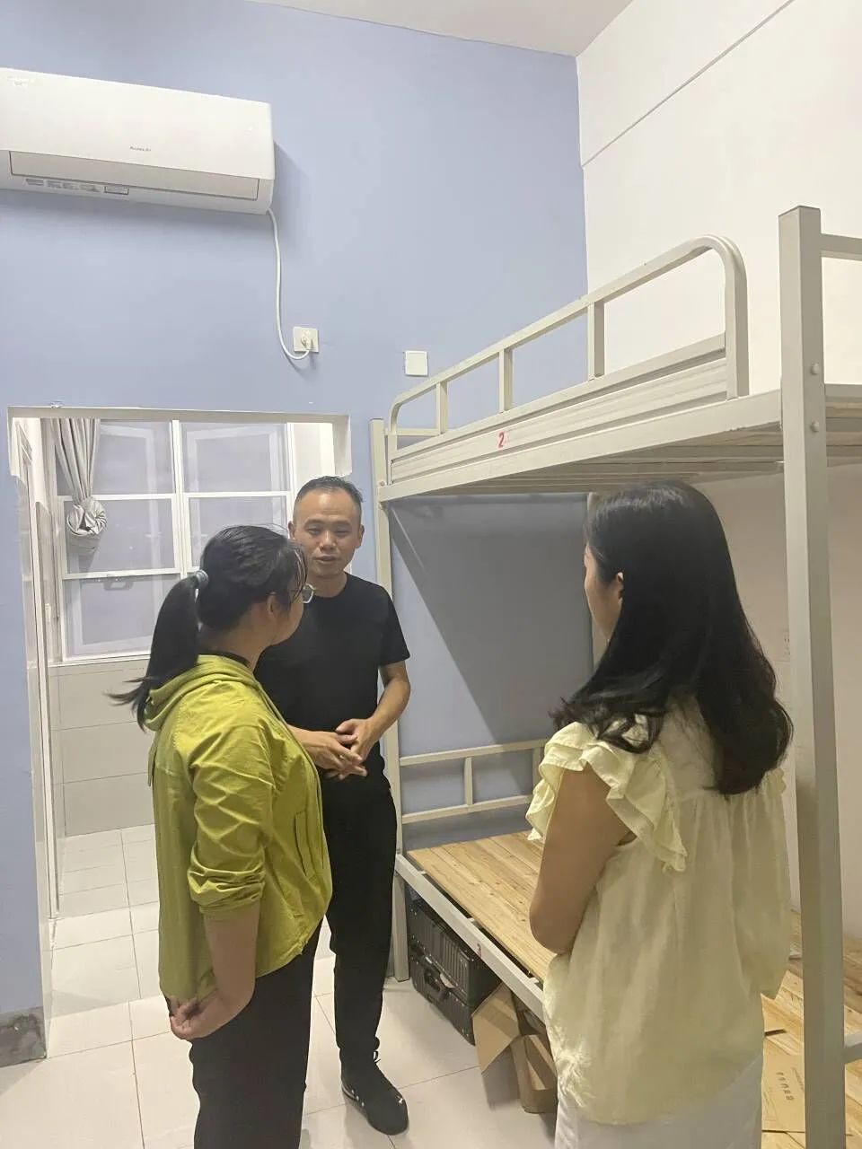 晚上7点,公司党总支书记高伟老师和综办主任凃君老师及新生辅导员杨瑾萱老师到24栋812寝室看望了成子怡同学,详细了解了员工在新寝室的生活情况,24号楼楼管程晨阿姨特别热心在该生入住后也一直帮员工熟悉生活环境,解决员工入住后存在的问题。在看到员工晚上床铺还没有铺好,询问得知床上用品还在菜鸟驿站没有取后,由于还在下大雨,24栋离商业街快递点较远,取件不便,为保证员工晚上能够休息好,高伟书记和两位老师带着员工驱车前往菜鸟驿站取回快递,让员工尽早铺好床铺好好休息,并叮嘱了安全和相关后续报到事宜。