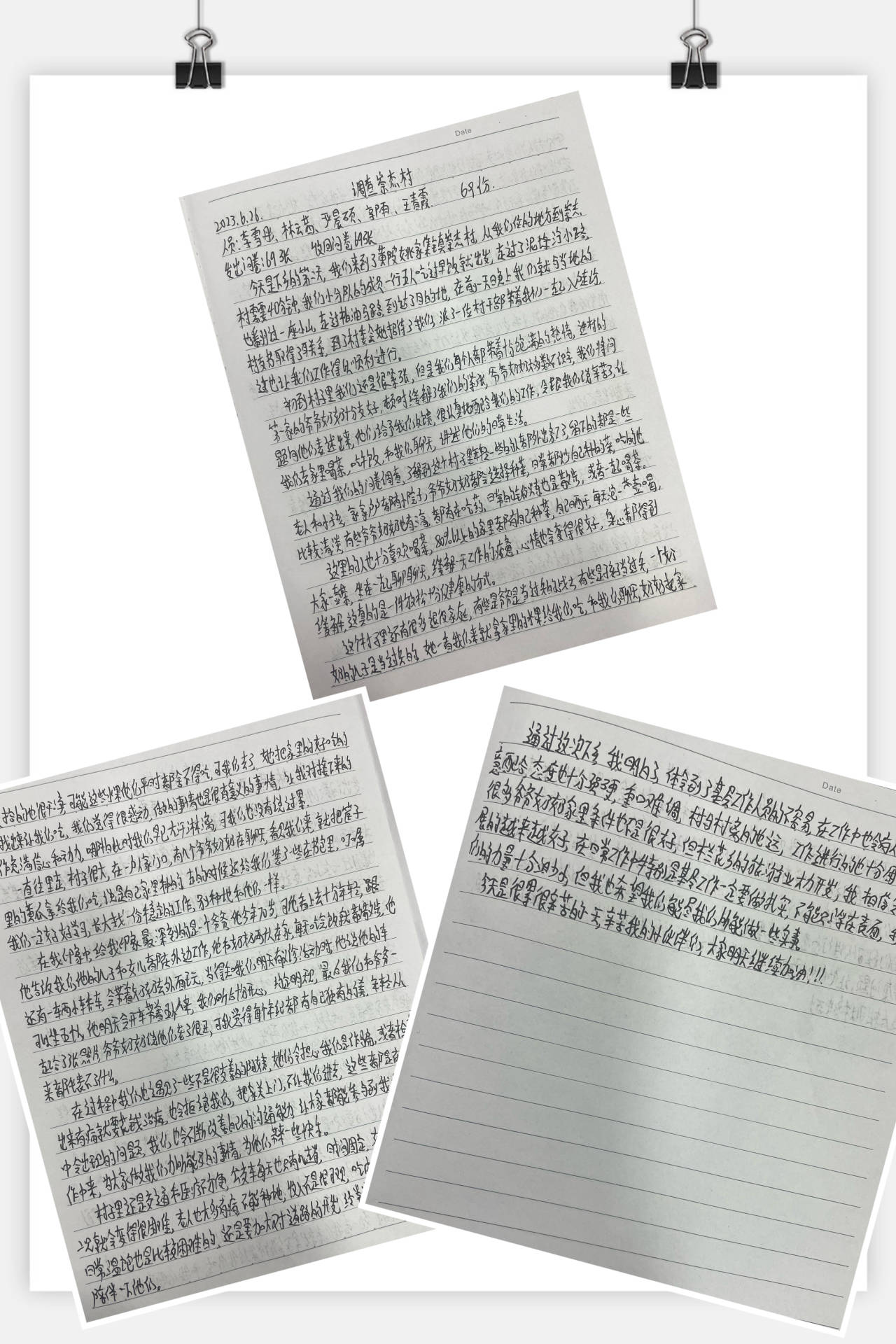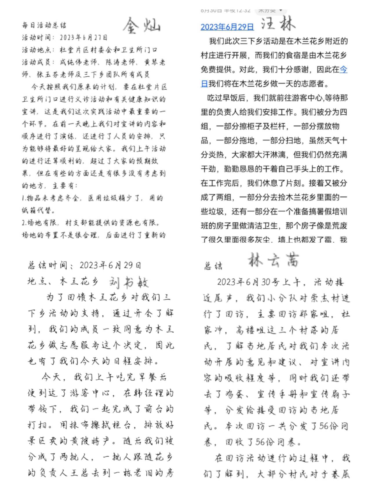 在活动进行的过程中,团队成员每天都会写实践日记,对一天的活动进行总结,记录了活动具体内容和开展情况、遇到的困难,以及心得体会,这对大家去了解基层群众,更好的走进群众有着非常重要的意义,并有利于促进团队成员之间对于工作的交流,同时,这也将成为一段不可磨灭的回忆,它会以文字、图片等的形式被永远保存。