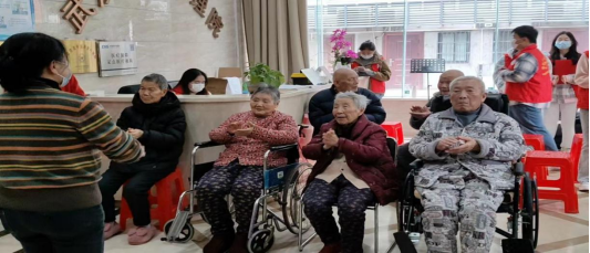 互动环节卡牌对对碰激发了老人们的童心和好胜心,大家争相参与,力争赢得志愿者们事先亲手制作的手链,艾草香囊以及手书“福”贴等礼物。歌曲《天蓝蓝》、笛子曲《大鱼》,集体舞《新年快乐》、手部操、寻找欢乐球等节目的精心演绎,更是让老人们开心不已。